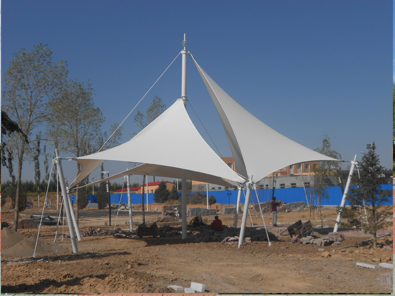 景觀膜結構 景觀膜結構又稱張拉膜景觀,主要通過膜結構的張拉式 呈現(xiàn)出唯美的結構特征;膜材料是指聚酯纖維基布或PVDF、PVF、PTFE等不同的表面涂層,配以優(yōu)質的PVC組成的具有穩(wěn)定的形態(tài),并可承受一定載荷的建筑紡織品。它的壽命因不同的表面涂層而異,一般可達成10-20年;其外觀整潔大方,自潔性強。主要應用于各大公園,世博園,和一些廣場,商場等場所。