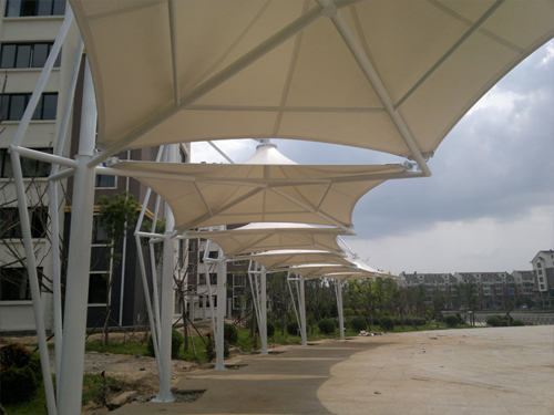 景觀膜結構又稱張拉膜景觀,主要通過膜結構的張拉式 呈現出唯美的結構特征;膜材料是指聚酯纖維基布或PVDF、PVF、PTFE等不同的表面涂層,配以優質的PVC組成的具有穩定的形態,并可承受一定載荷的建筑紡織品。它的壽命因不同的表面涂層而異,一般可達成10-20年;其外觀整潔大方,自潔性強。主要應用于各大公園,世博園,和一些廣場,商場等場所。